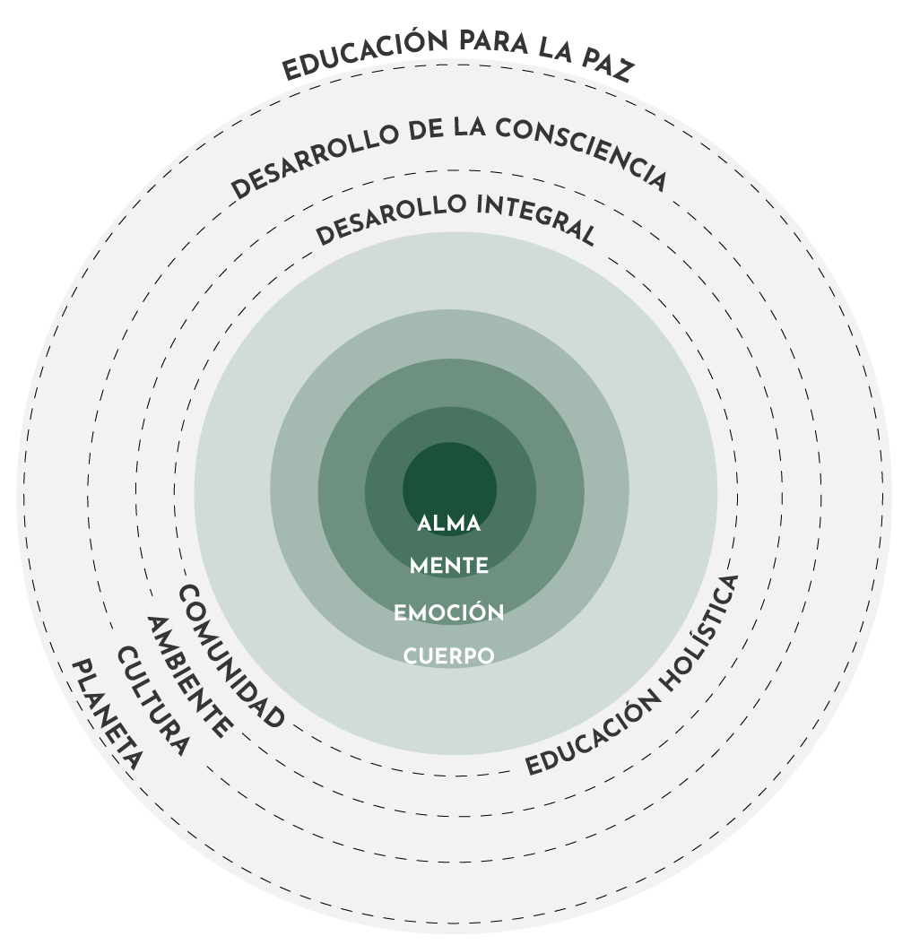 La filosofía Montessori, se centra en el desarrollo de todas las dimensiones de lo humano, a través de la experiencia, que significa aprender haciendo. Se busca dentro del método un buen balance entre el pensar y hacer, entre la reflexión y la acción. Esto puede ocurrir en un ambiente preparado que dispone de lo que la niñez, infancia y adolescencia necesitan, para un desarrollo y aprendizaje integral. El ambiente preparado, es más que los recursos de materiales, implica de manera central, un adulto o guía que es capaz de permitir que se desenvuelva y desarrolle la personalidad de cada niño, niña o joven, creciendo en una autonomía progresiva, independencia e interdependencia. Por tanto, Montessori adscribe al desarrollo paulatino de un ser humano consciente de sí mismo y del medio que lo rodea. Sólo desde este enfoque será posible lograr una educación para la paz.